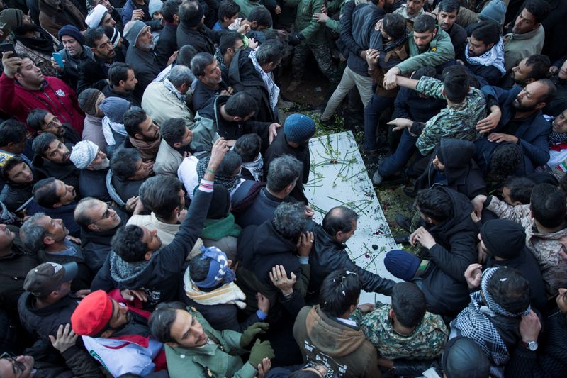 Mourners attend funeral and burial of Iranian Major-General and head of the elite Quds Force Qassem Soleimani, who was killed in an air strike at Baghdad airport, at his hometown in Kerman, Iran, January 8, 2020. Zoheir Seidanlou//WANA